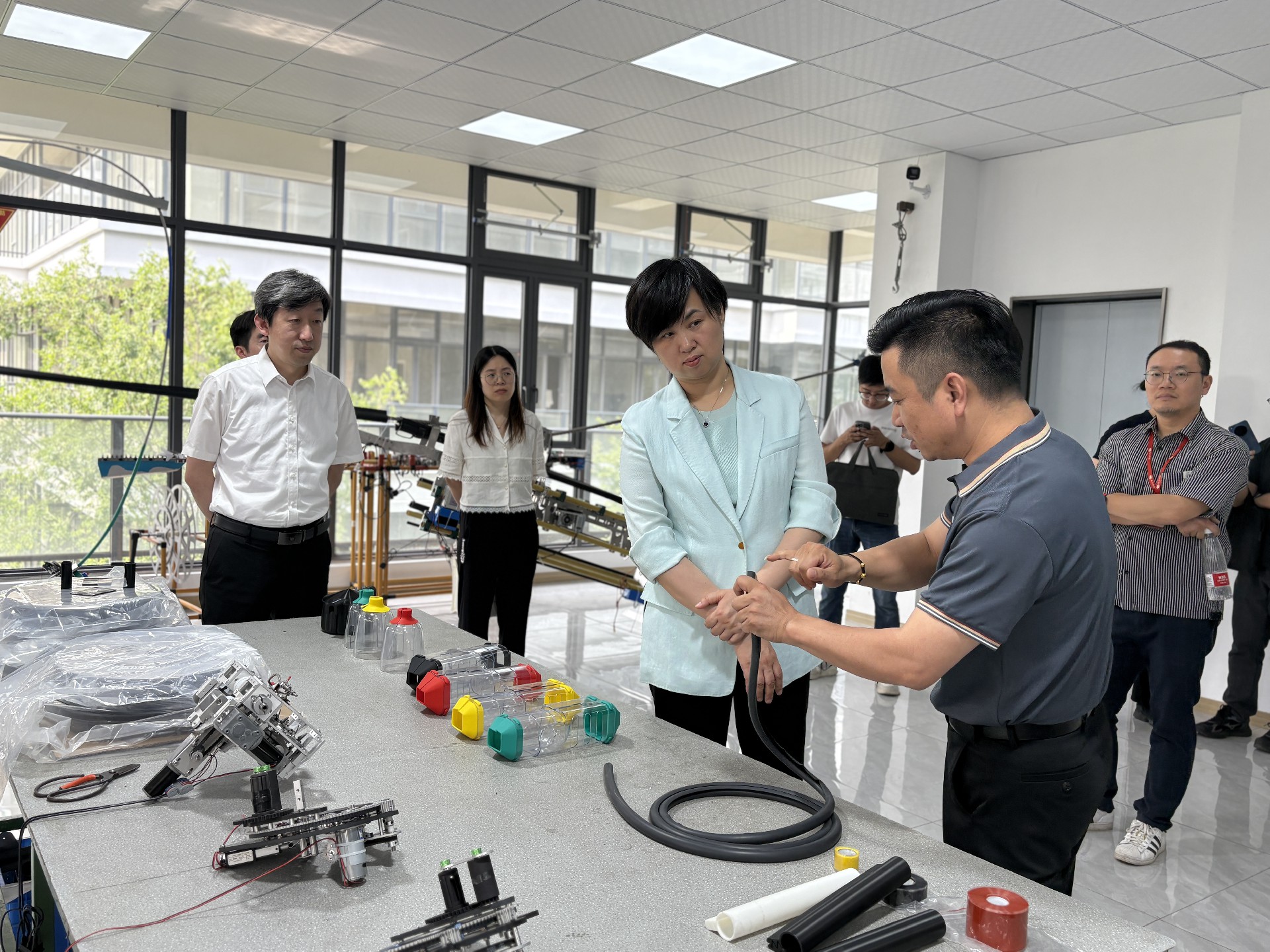 2025年5月27日,常州经济开发区党工委副书记、管委会主任刘敏同志莅临江苏瑞禧智能电力科技有限公司考察指导工作。对公司自主研发的各类带电作业智能机器人和新材料进行调研。